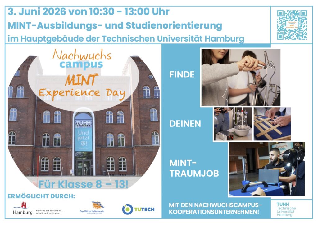 Am MINT Experience Day haben Schülerinnen und Schüler, interessierte Eltern sowie Unternehmensmitarbeitende die Möglichkeit, sich im Hauptgebäude der TU Hamburg mit Kooperationsunternehmen und Studierenden auszutauschen. An den vielen Ständen erleben die Besucherinnen und Besucher Technik und Naturwissenschaft hautnah mit: bei Mitmach-Aktivitäten und Mini-MINT-Experimenten gibt es viel zu lernen und auszuprobieren. Schülerinnen und Schüler können sich über das breite Studien- und Ausbildungsangebot an der TU Hamburg und in den beteiligten Unternehmen informieren.